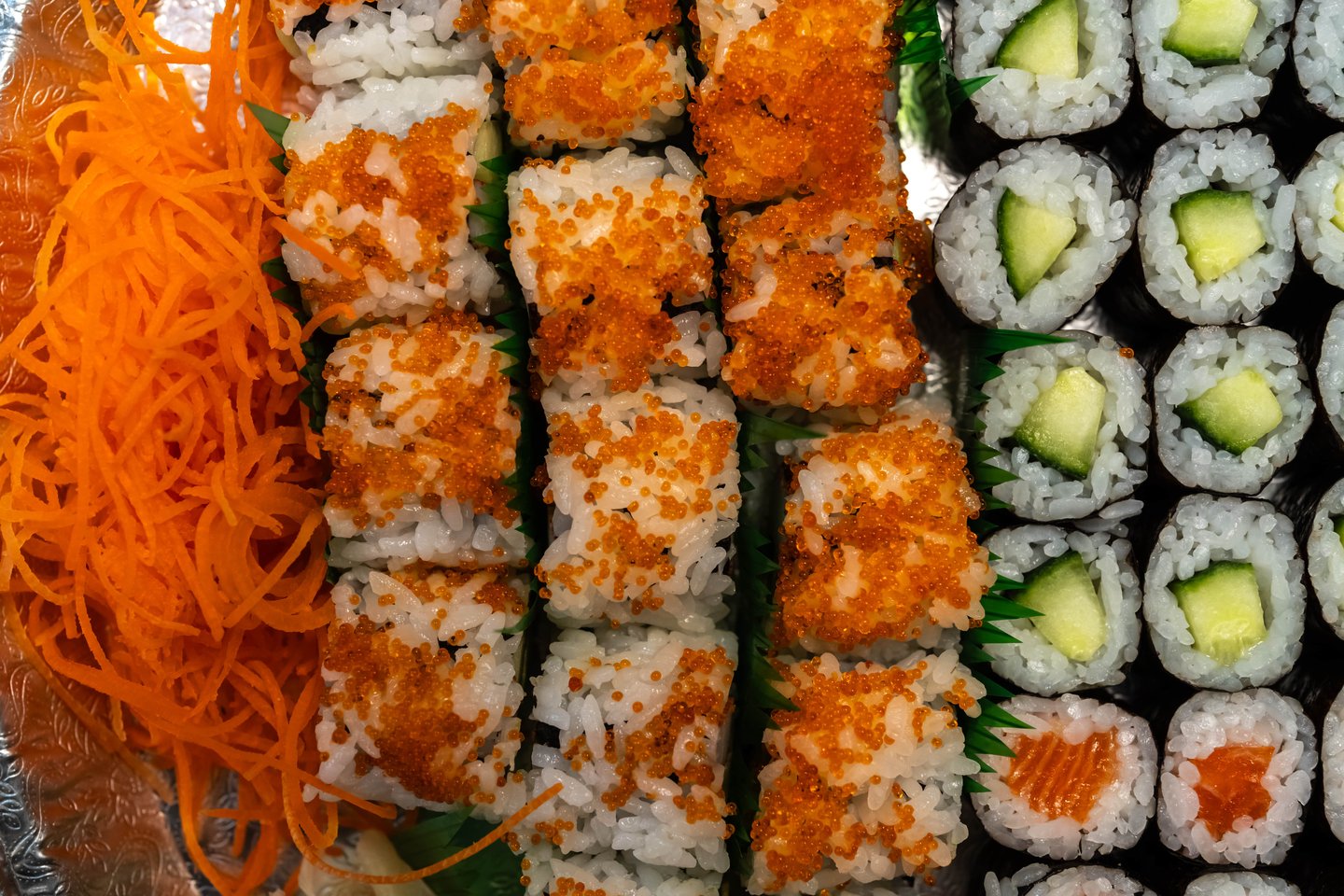 8 pieces. Crab, avocado, cucumber and tobiko wrapped in seaweed and rice. Topped with: Atlantic salmon, avocado, red tuna and snapper.